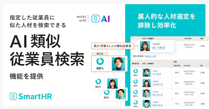 当社では人的資本経営の実践で難所となる、データを用いた科学的な施策推進を支援する機能の開発も推進しています。「SmartHR」が独自に保有する従業員データとAIを組み合わせた機能の開発を通して、企業がデータドリブンで科学的な人的資本経営を推進するためのパートナーになることを目指してまいります。